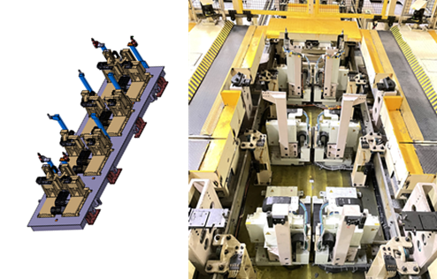 (2)不同的車身,寬度不一致時(shí),利用公司研發(fā)的氣動(dòng)伺服結(jié)構(gòu),實(shí)現(xiàn)多車型柔性共線;
